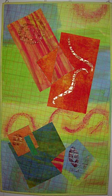My own hand dyed and painted cottons , stamped designs and hand beading add to this abstract construction.