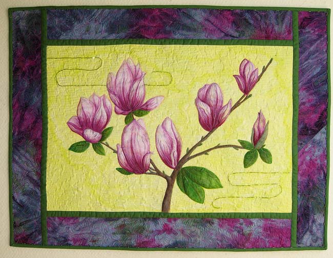 The magnolia soulangiana that blooms magnificently every January in our southern California garden. A painted wholecloth wall hanging with beaded embellishments.
