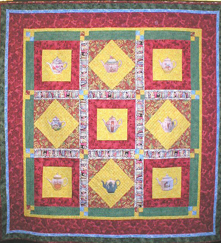 Digitally printed images of 18th century porcelain teapots are the focus of this trditionally set quilt