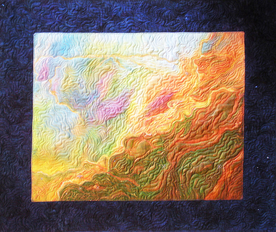 A photo from the Hubble Space Telesope of an explosion of gasses in the Crab Nebula inspired this painted wholecloth quilt with beaded embellishments.